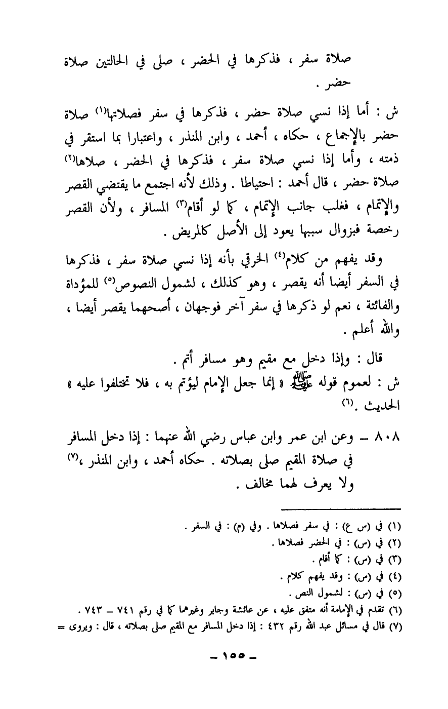 808 - وعن ابن عمر وابن عباس - رَضِيَ اللَّهُ عَنْهُمَا -: إذا دخل المسافر في صلاة المقيم صلى بصلاته. حكاه أحمد، وابن المنذر، ولا يعرف لهما مخالف.