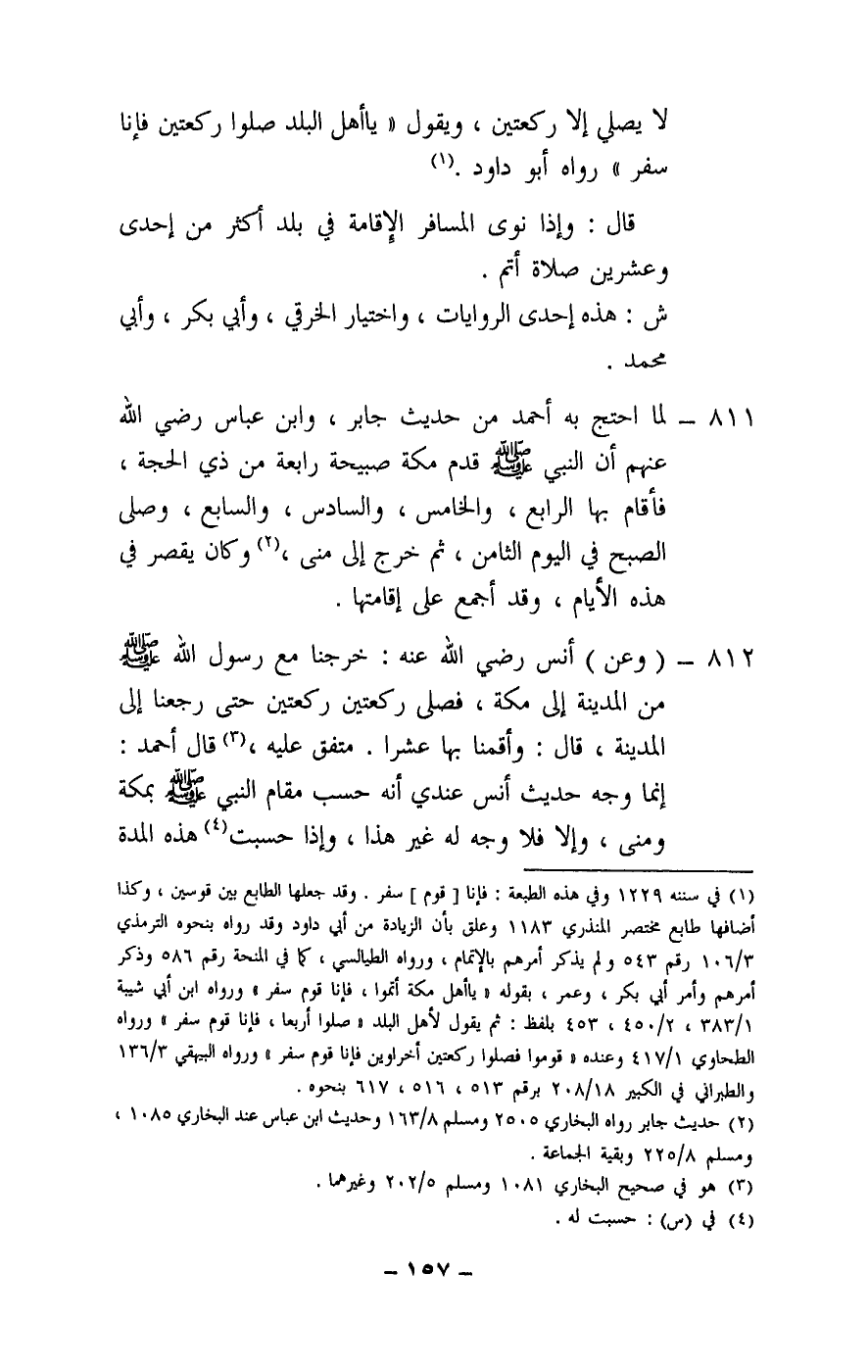 811 - لما احتج به أحمد من حديث جابر، وابن عباس - رَضِيَ اللَّهُ عَنْهُمْ - أن النبي - صَلَّى اللَّهُ عَلَيْهِ وَسَلَّمَ - «قدم مكة صبيحة رابعة من ذي الحجة، فأقام بها الرابع، والخامس، والسادس، والسابع، وصلى الصبح في اليوم الثامن، ثم خرج إلى منى، وكان يقصر في هذه الأيام، وقد أجمع على إقامتها» .