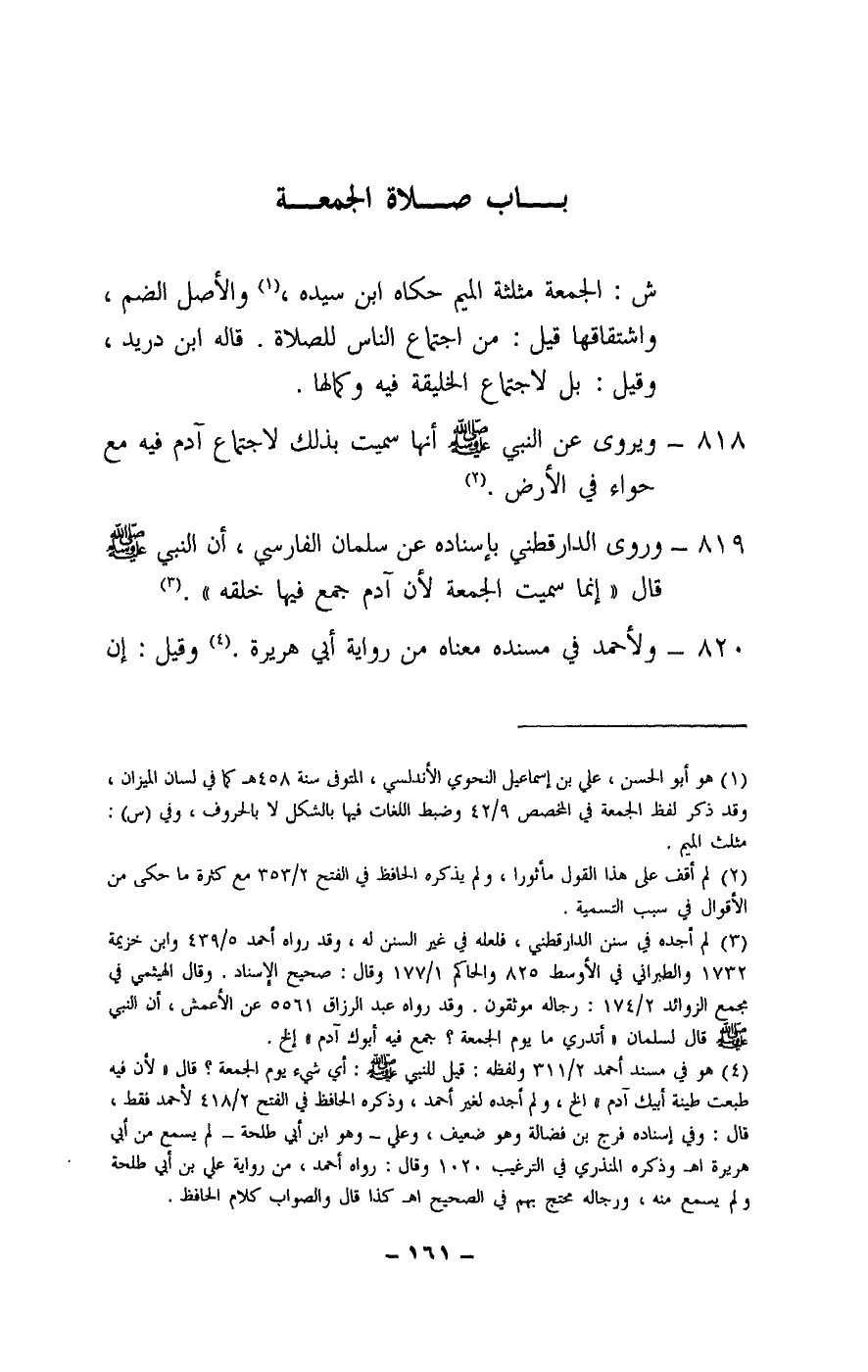 819 - وروى الدارقطني بإسناده عن سلمان الفارسي، أن النبي - صَلَّى اللَّهُ عَلَيْهِ وَسَلَّمَ - قال: «إنما سميت الجمعة لأن آدم جمع فيها خلقه» .