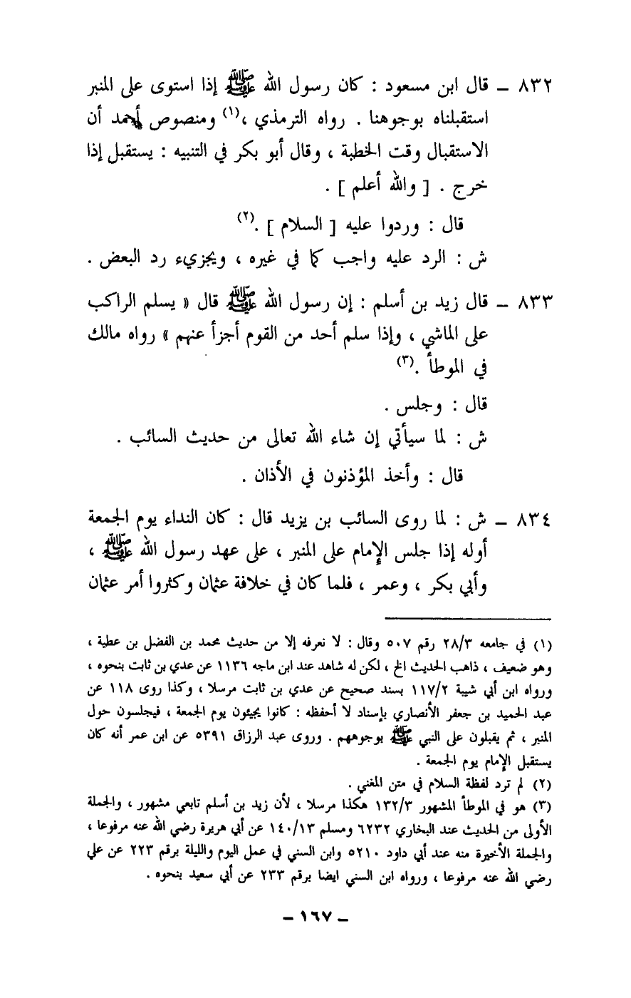 832 - «قال ابن مسعود: كان رسول الله - صَلَّى اللَّهُ عَلَيْهِ وَسَلَّمَ - إذا استوى على المنبر استقبلناه بوجوهنا» . رواه الترمذي، ومنصوص أحمد أن الاستقبال وقت الخطبة، وقال أبو بكر في التنبيه: يستقبل إذا خرج. [والله أعلم] .