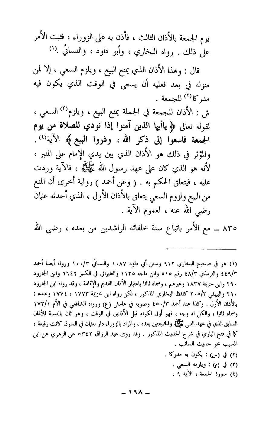 ش: الأذان للجمعة في الجملة يمنع البيع، ويلزم السعي، لِقَوْلِهِ تَعَالَى: {يَاأَيُّهَا الَّذِينَ آمَنُوا إِذَا نُودِيَ لِلصَّلَاةِ مِنْ يَوْمِ الْجُمُعَةِ فَاسْعَوْا إِلَى ذِكْرِ اللَّهِ وَذَرُوا الْبَيْعَ} [الجمعة: 9] الآية.