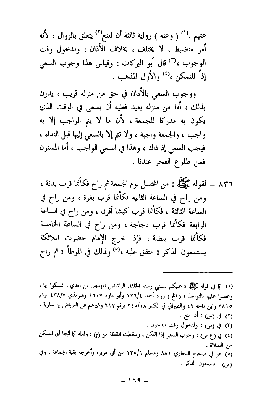 836 - لقوله: - صَلَّى اللَّهُ عَلَيْهِ وَسَلَّمَ - « «من اغتسل يوم الجمعة ثم راح فكأنما قرب بدنة، ومن راح في الساعة الثانية فكأنما قرب بقرة، ومن راح في الساعة الثالثة، فكأنما قرب كبشا أقرن، ومن راح في الساعة الرابعة فكأنما قرب دجاجة، ومن راح في الساعة الخامسة فكأنما قرب بيضة، فإذا خرج الإمام حضرت الملائكة يستمعون الذكر» متفق عليه، ولمالك في الموطأ «ثم راح