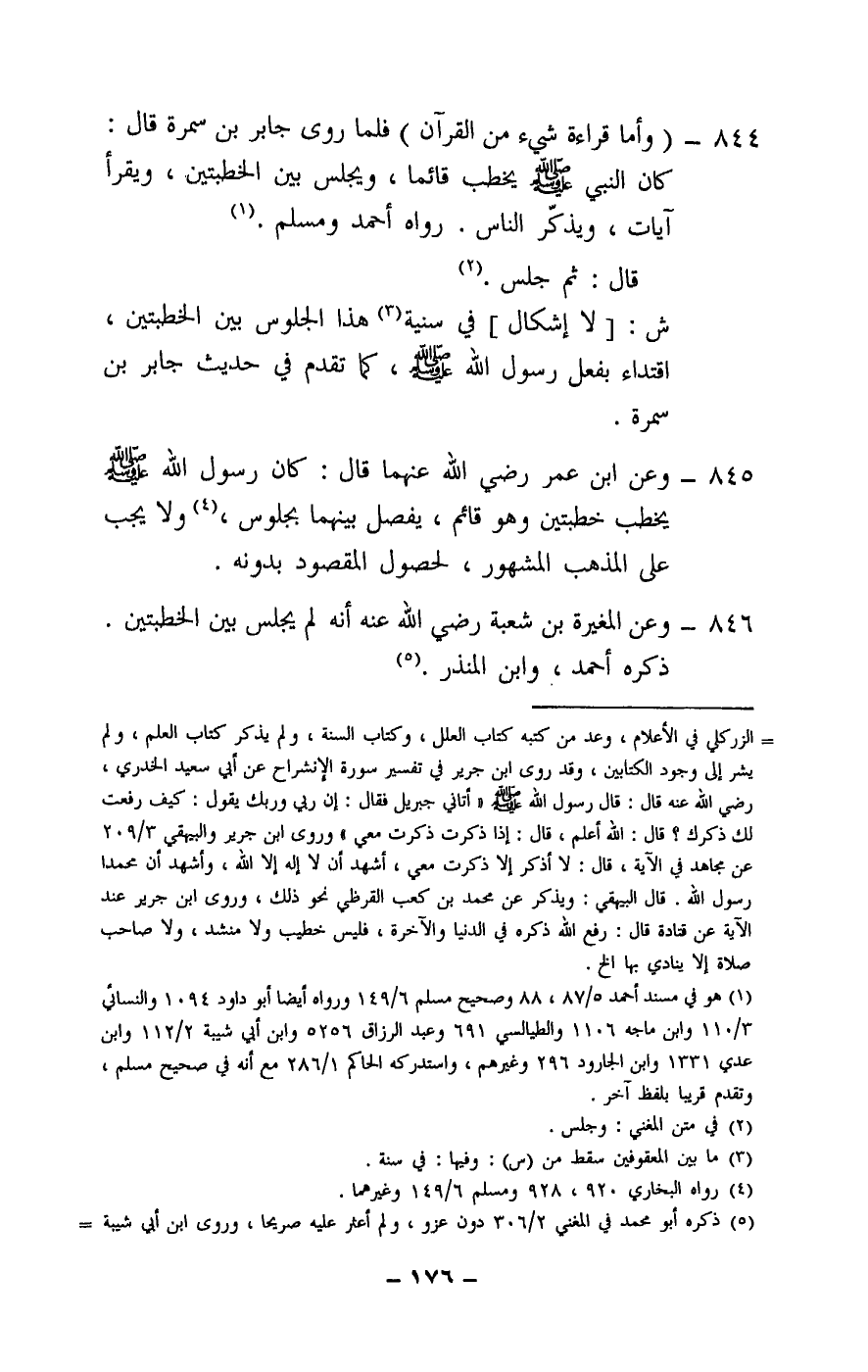 844 - (وأما قراءة شيء من القرآن) فلما روى جابر بن سمرة قال: «كان النبي - صَلَّى اللَّهُ عَلَيْهِ وَسَلَّمَ - يخطب قائما، ويجلس بين الخطبتين، ويقرأ آيات، ويذكر الناس» . رواه أحمد ومسلم.