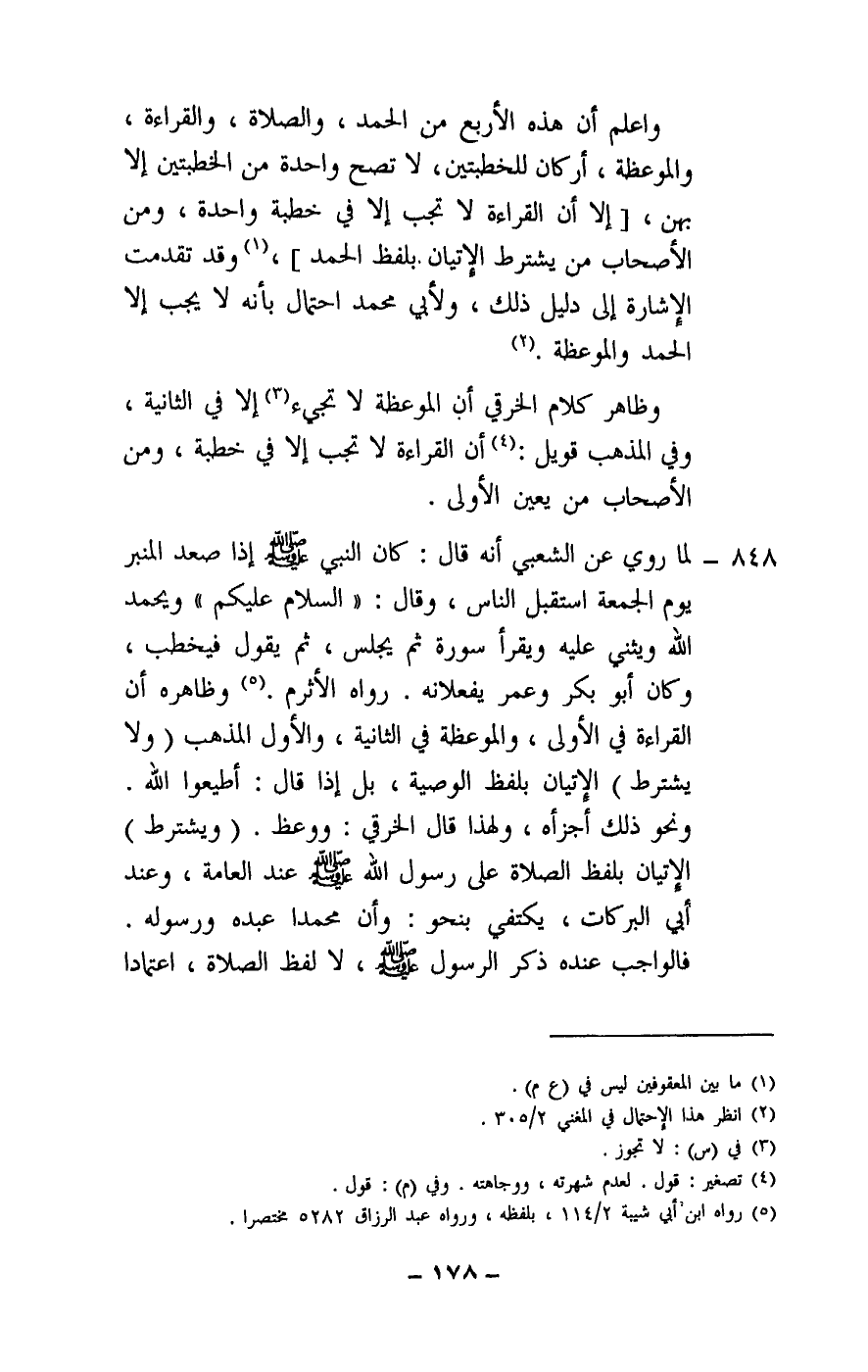 848 - لما روي عن الشعبي أنه قال: «كان النبي - صَلَّى اللَّهُ عَلَيْهِ وَسَلَّمَ - إذا صعد المنبر يوم الجمعة استقبل الناس، وقال: «السلام عليكم» ويحمد الله ويثني عليه ويقرأ سورة ثم يجلس» ، ثم يقول: فيخطب، وكان أبو بكر وعمر يفعلانه. رواه الأثرم. وظاهره أن القراءة في الأولى، والموعظة في الثانية، والأول المذهب (ولا يشترط) الإتيان بلفظ الوصية، بل إذا قال: أطيعوا الله. ونحو ذلك أجزأه، ولهذا قال الخرقي: ووعظ. (ويتشرط) الإتيان بلفظ الصلاة على رسول الله - صَلَّى اللَّهُ عَلَيْهِ وَسَلَّمَ - عند العامة، وعند أبي البركات، يكتفي بنحو: وأن محمدا عبده ورسوله. فالواجب عنده ذكر الرسول - صَلَّى اللَّهُ عَلَيْهِ وَسَلَّمَ - لا لفظ الصلاة، اعتمادا