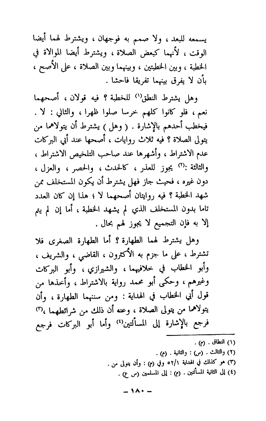 وهل يشترط النطق للخطبة؟ فيه قولان، أصحهما نعم، فلو كانوا كلهم خرسا صلوا ظهرا، والثاني: لا. فيخطب أحدهم بالإشارة. (وهل) يشترط أن يتولاهما من يتولى الصلاة؟ فيه ثلاث روايات: أصحها عند أبي البركات عدم الاشتراط، وأشهرها عند صاحب التلخيص الاشتراط، والثالثة يجوز للعذر كالحدث والحصر والعزل دون غيره فحيث جاز فهل يشترط أن يكون المستخلف ممن شهد الخطبة؟ فيه روايتان أصحهما لا؛ هذا إن كان العدد تاما بدون المستخلف الذي لم يشهد الخطبة، أما إن لم يتم إلا به فإن التجميع لا يجوز لهم بحال.