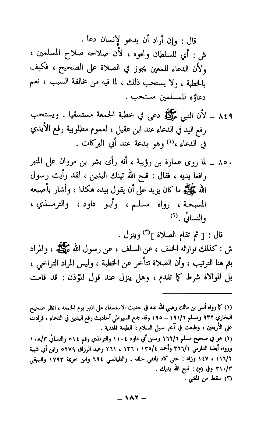 849 - لأن النبي - صَلَّى اللَّهُ عَلَيْهِ وَسَلَّمَ - دعا في خطبة الجمعة مستسقيا. ويستحب رفع اليد في الدعاء عند ابن عقيل، لعموم مطلوبية رفع الأيدي في الدعاء، وهو بدعة عند أبي البركات.