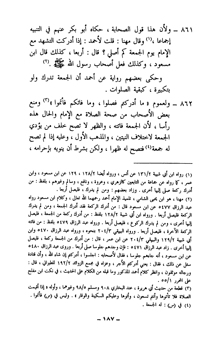 861 - ولأن هذا قول الصحابة، حكاه أبو بكر عنهم في التنبيه إجماعا، وقال مهنا: قلت لأحمد: إذا أدركت التشهد مع الإمام يوم الجمعة كم أصلي؟ قال: أربعا، كذلك قال ابن مسعود، وكذلك فعل أصحاب رسول الله - صَلَّى اللَّهُ عَلَيْهِ وَسَلَّمَ -.