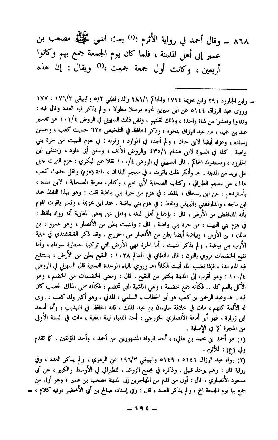 868 - وقال أحمد في رواية الأثرم: «بعث النبي - صَلَّى اللَّهُ عَلَيْهِ وَسَلَّمَ - مصعب بن عمير إلى أهل المدينة، فلما كان يوم الجمعة جمع بهم وكانوا أربعين» وكانت أول جمعة جمعت، ويقال: إن هذه