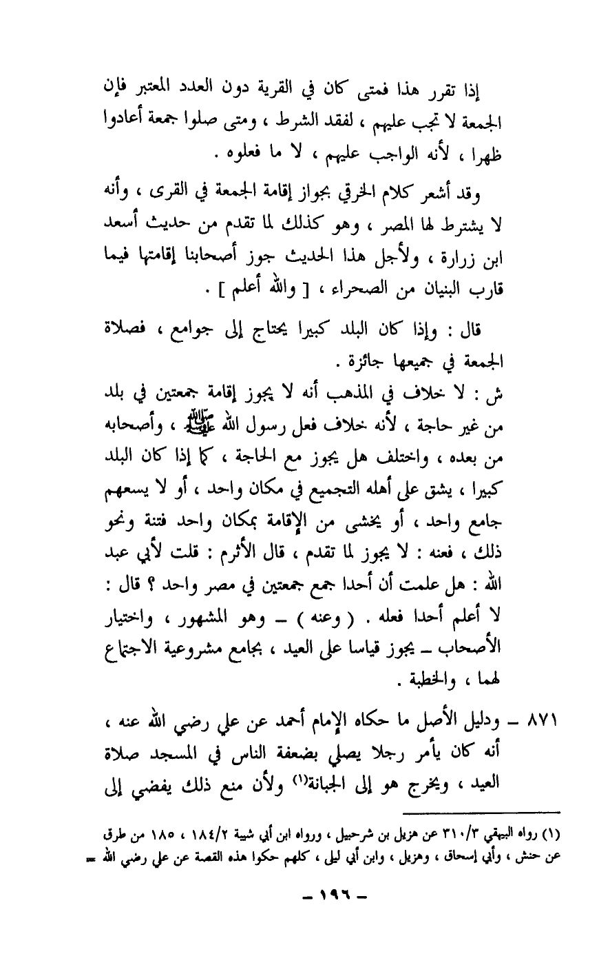 871 - ودليل الأصل ما حكاه الإمام أحمد عن علي - رَضِيَ اللَّهُ عَنْهُ -، أنه كان يأمر رجلا يصلي بضعفة الناس في المسجد صلاة العيد، ويخرج هو إلى الجبانة ولأن منع ذلك يفضي إلى