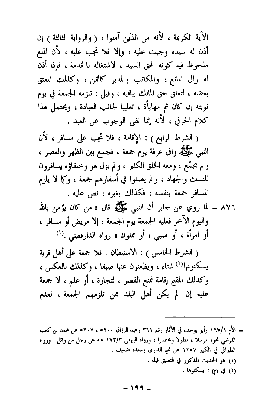 876 - لما روي عن جابر أن النبي - صَلَّى اللَّهُ عَلَيْهِ وَسَلَّمَ - قال: «من كان يؤمن بالله واليوم الآخر فعليه الجمعة يوم الجمعة، إلا مريض أو مسافر، أو امرأة، أو صبي، أو مملوك» رواه الدارقطني.