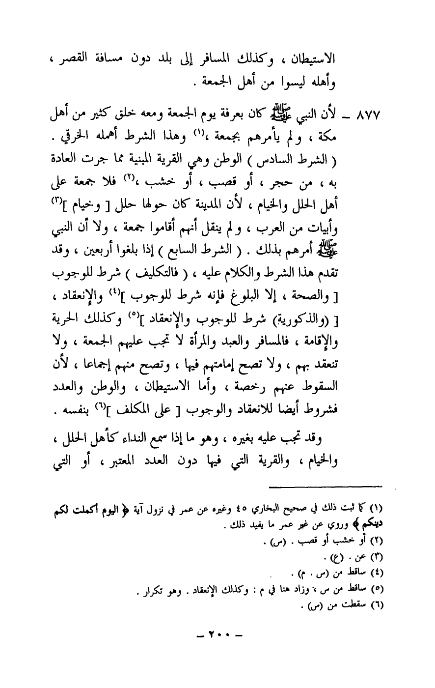 877 - لأن النبي - صَلَّى اللَّهُ عَلَيْهِ وَسَلَّمَ - كان بعرفة يوم الجمعة ومعه خلق كثير من أهل مكة، ولم يأمرهم بجمعة، وهذا الشرط أهمله الخرقي. (الشرط السادس) الوطن وهي القرية المبنية مما جرت العادة به، من حجر، أو قصب، أو خشب، فلا جمعة على أهل الحلل والخيام، لأن المدينة كان حولها حلل [وخيام] وأبيات من العرب، ولم ينقل أنهم أقاموا جمعة، ولا أن النبي - صَلَّى اللَّهُ عَلَيْهِ وَسَلَّمَ - أمرهم بذلك.