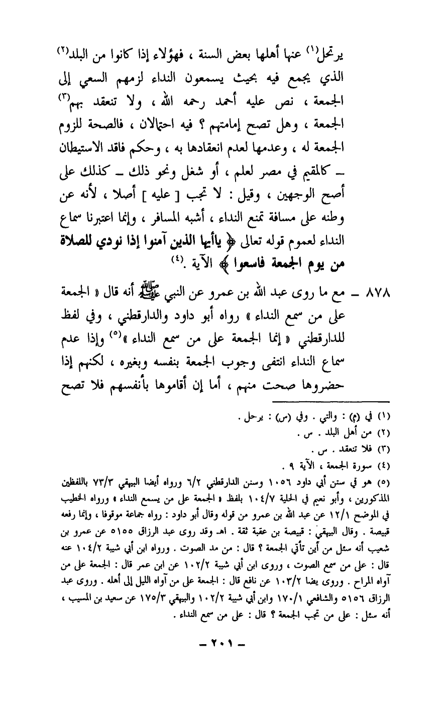 878 - مع ما روى عبد الله بن عمرو عن النبي - صَلَّى اللَّهُ عَلَيْهِ وَسَلَّمَ - أنه قال: «الجمعة على من سمع النداء» رواه أبو داود والدارقطني، وفي لفظ للدارقطني «إنما الجمعة على من سمع النداء» » وإذا عدم سماع النداء انتفى وجوب الجمعة بنفسه وبغيره، لكنهم إذا حضروها صحت منهم، أما إن أقاموها بأنفسهم فلا تصح