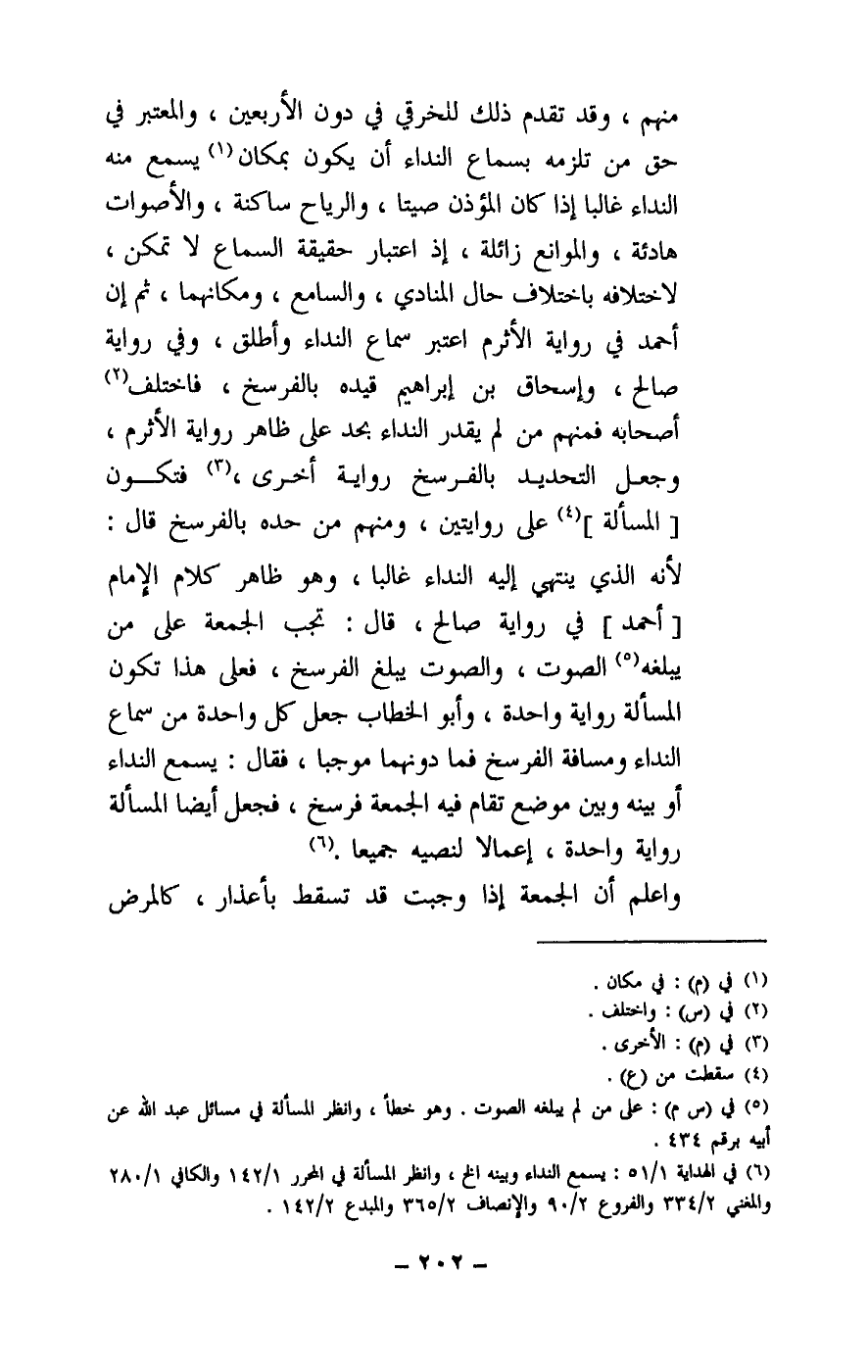 منهم، وقد تقدم ذلك للخرقي في دون الأربعين، والمعتبر في حق من تلزمه بسماع النداء أن يكون بمكان يسمع منه النداء غالبا إذا كان المؤذن صيتا، والرياح ساكنة، والأصوات هادئة والموانع زائلة، إذ اعتبار حقيقة السماع لا تمكن، لاختلافه باختلاف حال المنادي، والسامع، ومكانهما، ثم إن أحمد في رواية الأثرم اعتبر سماع النداء وأطلق، وفي رواية صالح، وإسحاق بن إبراهيم قيده بالفرسخ، فاختلف أصحابه فمنهم من لم يقدر النداء بحد على ظاهر رواية الأثرم، وجعل التحديد بالفرسخ رواية أخرى، فتكون [المسألة] على روايتين، ومنهم من حده بالفرسخ قال: لأنه الذي ينتهي إليه النداء غالبا، وهو ظاهر كلام الإمام [أحمد] في رواية صالح، قال: تجب الجمعة على من يبلغه الصوت، والصوت يبلغ الفرسخ، فعلى هذا تكون المسألة رواية واحدة، وأبو الخطاب جعل كل واحدة من سماع النداء ومسافة الفرسخ فما دونهما موجبا، فقال: يسمع النداء أو بينه وبين موضع تقام فيه الجمعة فرسخ، فجعل أيضا المسألة رواية واحدة، إعمالا لنصيه جميعا.