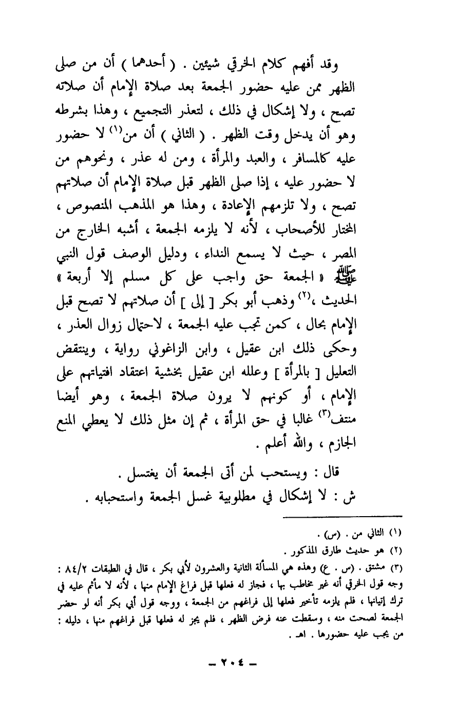 (الثاني) : أن من لا حضور عليه كالمسافر، والعبد والمرأة، ومن له عذر، ونحوهم من لا حضور عليه، إذا صلى الظهر قبل صلاة الإمام أن صلاتهم تصح، ولا تلزمهم الإعادة، وهذا هو المذهب المنصوص، المختار للأصحاب، لأنه لا يلزمه الجمعة، أشبه الخارج من المصر، حيث لا يسمع النداء، ودليل الوصف قول النبي - صَلَّى اللَّهُ عَلَيْهِ وَسَلَّمَ - «الجمعة حق واجب على كل مسلم إلا أربعة» الحديث، وذهب أبو بكر [إلى] أن صلاتهم لا تصح قبل الإمام بحال، كمن تجب عليه الجمعة، لاحتمال زوال العذر، وحكى ذلك ابن عقيل، وابن الزاغوني رواية، وينتقض التعليل [بالمرأة] وعلله ابن عقيل بخشية اعتقاد افتياتهم على الإمام، أو كونهم لا يرون صلاة الجمعة، وهو أيضا منتف غالبا في حق المرأة، ثم إن مثل ذلك لا يعطي المنع الجازم، والله أعلم.