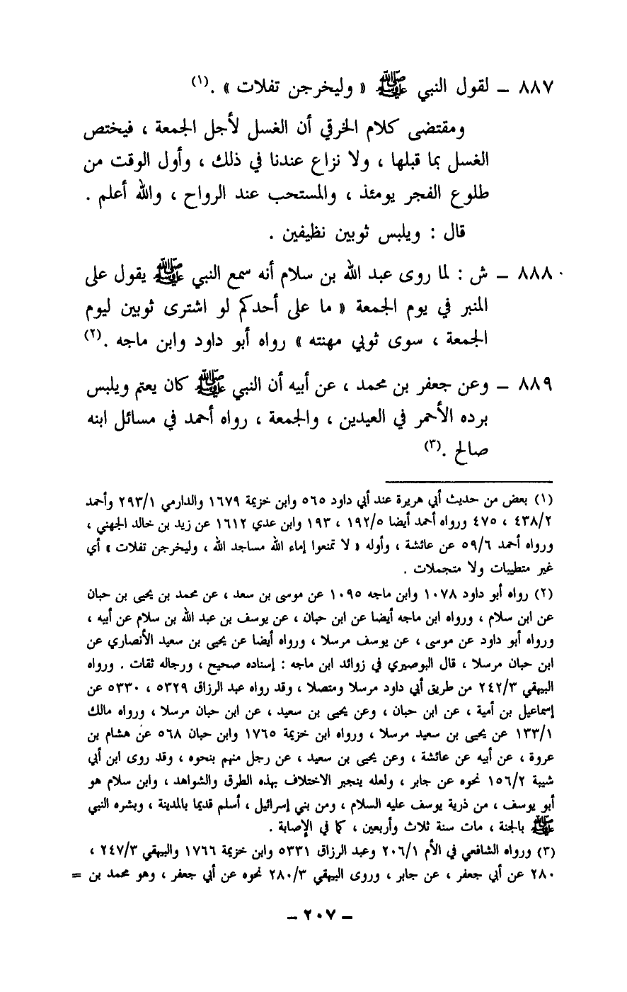 888 - ش: لما روى عبد الله بن سلام أنه سمع النبي - صَلَّى اللَّهُ عَلَيْهِ وَسَلَّمَ - يقول على المنبر في يوم الجمعة «ما على أحدكم لو اشترى ثوبين ليوم الجمعة، سوى ثوبي مهنته» رواه أبو داود وابن ماجه.