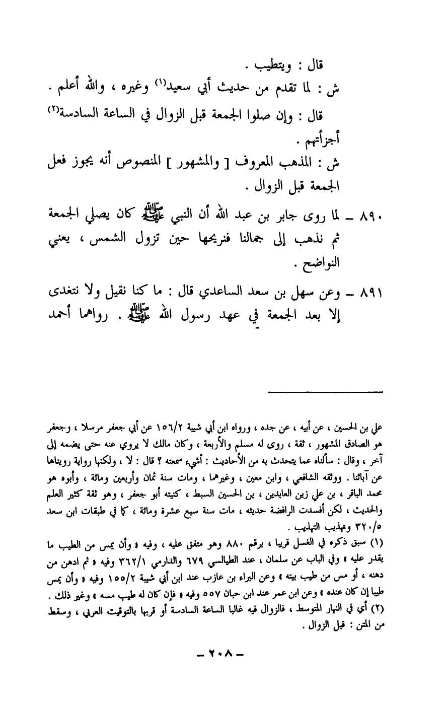 890 - لما روى جابر بن عبد الله «أن النبي - صَلَّى اللَّهُ عَلَيْهِ وَسَلَّمَ - كان يصلي الجمعة ثم نذهب إلى جمالنا فنزيحها حين تزول الشمس، يعني النواضح» .