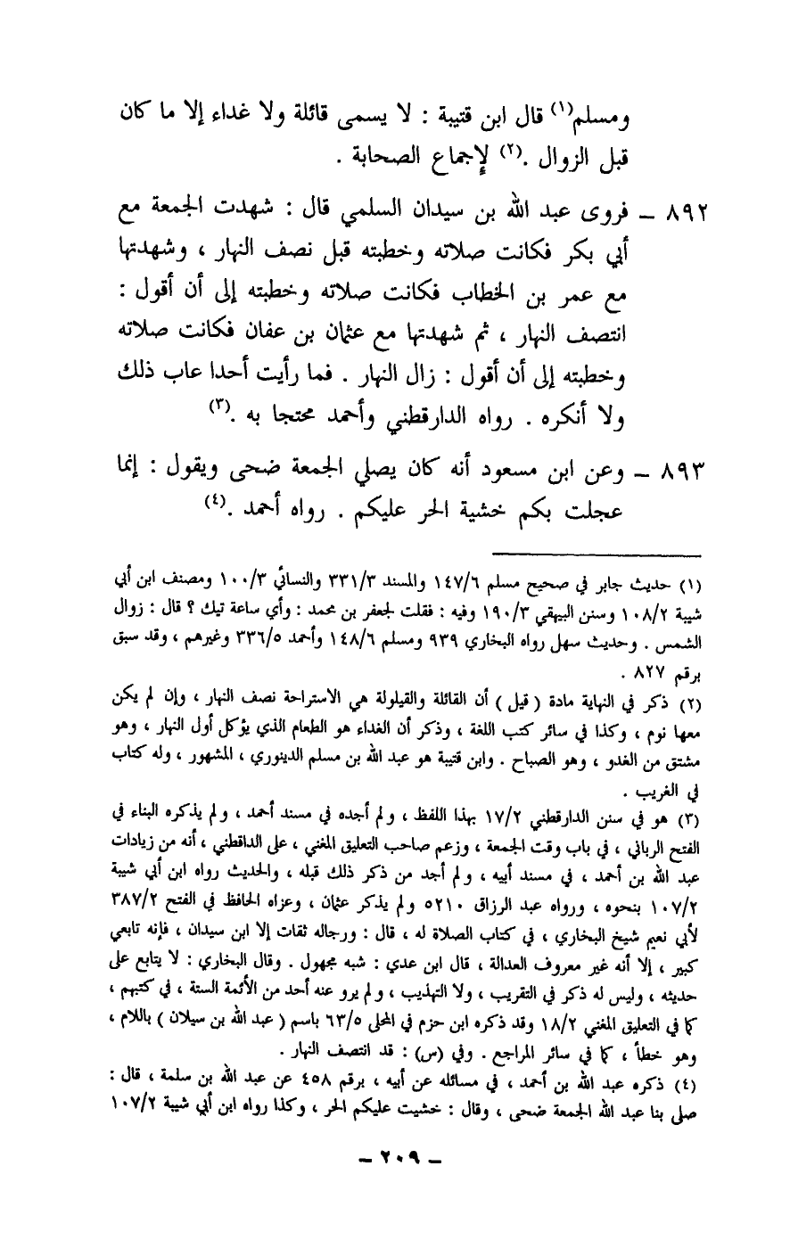 892 - فروى عبد الله بن سيدان السلمي قال: شهدت الجمعة مع أبي بكر فكانت صلاته وخطبته قبل نصف النهار وشهدتها مع عمر بن الخطاب فكانت صلاته وخطبته إلى أن أقول: انتصف النهار، ثم شهدتها مع عثمان بن عفان فكانت صلاته وخطبته إلى أن أقول: زال النهار. فما رأيت أحدا عاب ذلك ولا أنكره. رواه الدارقطني وأحمد محتجا به.