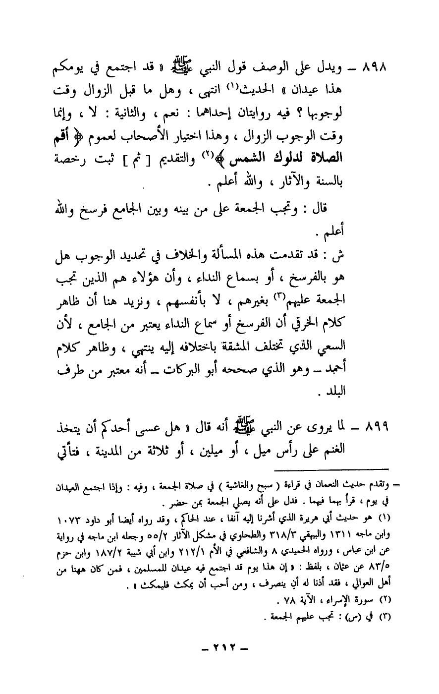 898 - ويدل على الوصف قول النبي - صَلَّى اللَّهُ عَلَيْهِ وَسَلَّمَ -: «قد اجتمع في يومكم هذا عيدان» الحديث انتهى، وهل من قبل الزوال وقت لوجوبها؟ فيه روايتان إحداهما: نعم، والثانية: لا، وإنما وقت الوجوب الزوال، وهذا اختيار الأصحاب لعموم {أَقِمِ الصَّلَاةَ لِدُلُوكِ الشَّمْسِ} [الإسراء: 78] والتقديم [ثم] ثبت رخصة بالسنة والآثار، والله أعلم.