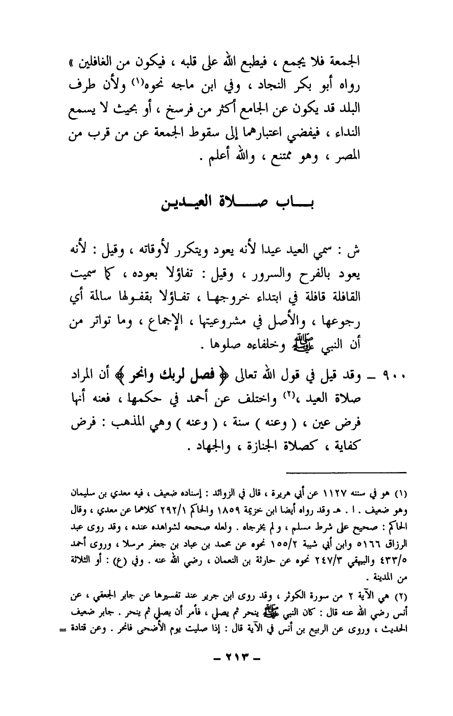 900 - وقد قيل في قول الله تعالى: {فَصَلِّ لِرَبِّكَ وَانْحَرْ} [الكوثر: 2] أن المراد صلاة العيد، واختلف عن أحمد في حكمها، فعنه أنها فرض عين، (وعنه) سنة، (وعنه) وهي المذهب: فرض كفاية، كصلاة الجنازة، والجهاد.
