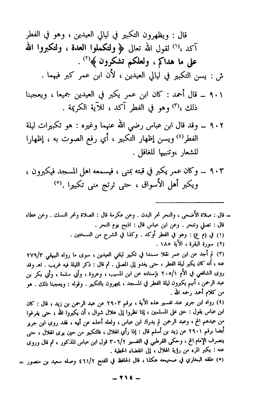 901 - قال أحمد: كان ابن عمر يكبر في العيدين جميعا، ويعجبنا ذلك، وهو في الفطر آكد، للآية الكريمة.