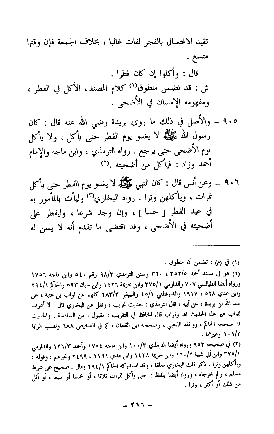 906 - وعن أنس قال: «كان النبي - صَلَّى اللَّهُ عَلَيْهِ وَسَلَّمَ - لا يغدو يوم الفطر حتى يأكل تمرات، ويأكلهن وترا» . رواه البخاري وليأت بالمأمور به في عيد الفطر [حسا] ، وإن وجد شرعا، وليفطر على أضحيته في الأضحى، وقد اقتضى ما تقدم أنه لا يسن له