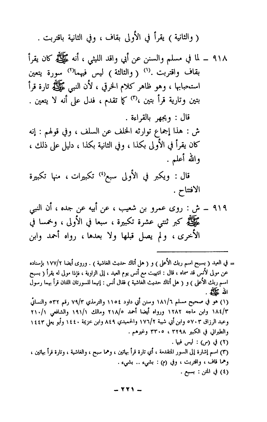 918 - لما في مسلم والسنن عن أبي واقد الليثي، «أنه - صَلَّى اللَّهُ عَلَيْهِ وَسَلَّمَ - كان يقرأ بقاف واقتربت» .