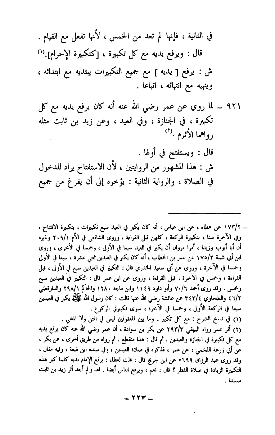 921 - لما روي عن عمر - رَضِيَ اللَّهُ عَنْهُ - أنه كان يرفع يديه مع كل تكبيرة، في الجنازة، وفي العيد، وعن زيد بن ثابت مثله رواهما الأثرم.