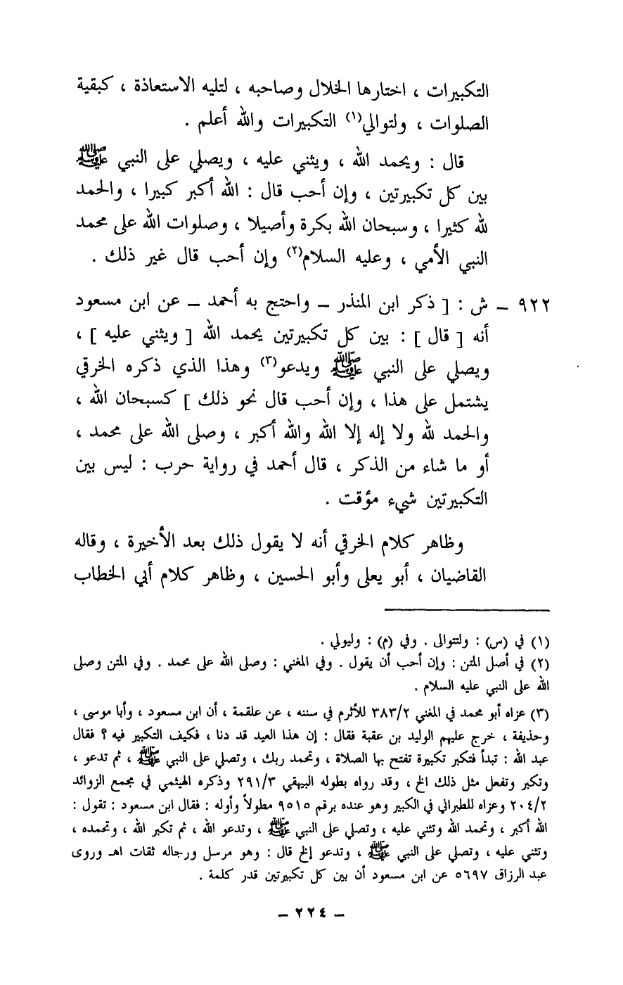 922 - ش: [ذكر ابن المنذر - واحتج به أحمد - عن ابن مسعود أنه [قال] : بين كل تكبيرتين يحمد الله [ويثني عليه] ، ويصلي على النبي - صَلَّى اللَّهُ عَلَيْهِ وَسَلَّمَ - ويدعو وهذا الذي ذكره الخرقي يشتمل على هذا، وإن أحب قال نحو ذلك] كسبحان الله، والحمد الله ولا إله إلا الله والله أكبر، وصلى الله على محمد، أو ما شاء من الذكر، قال أحمد في رواية حرب: ليس بين التكبيرتين شيء مؤقت.