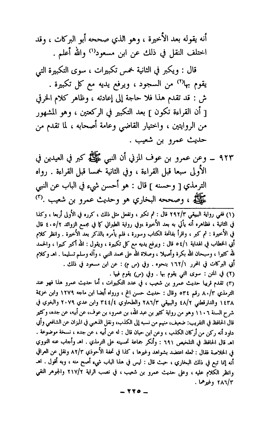 923 - وعن عمرو بن عوف المزني «أن النبي - صَلَّى اللَّهُ عَلَيْهِ وَسَلَّمَ - كبر في العيدين في الأولى سبعا قبل القراءة، وفي الثانية خمسا قبل القراءة» ، رواه الترمذي [وحسنه] قال: هو أحسن شيء في الباب عن النبي - صَلَّى اللَّهُ عَلَيْهِ وَسَلَّمَ - وصححه البخاري هو وحديث عمر بن شعيب.