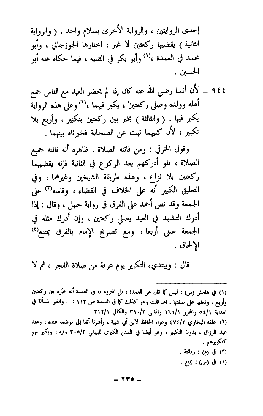 944 - لأن أنسا - رَضِيَ اللَّهُ عَنْهُ - كان إذا لم يحضر العيد مع الناس جمع أهله وولده وصلى ركعتين، يكبر فيهما، وعلى هذه الرواية يكبر فيها.