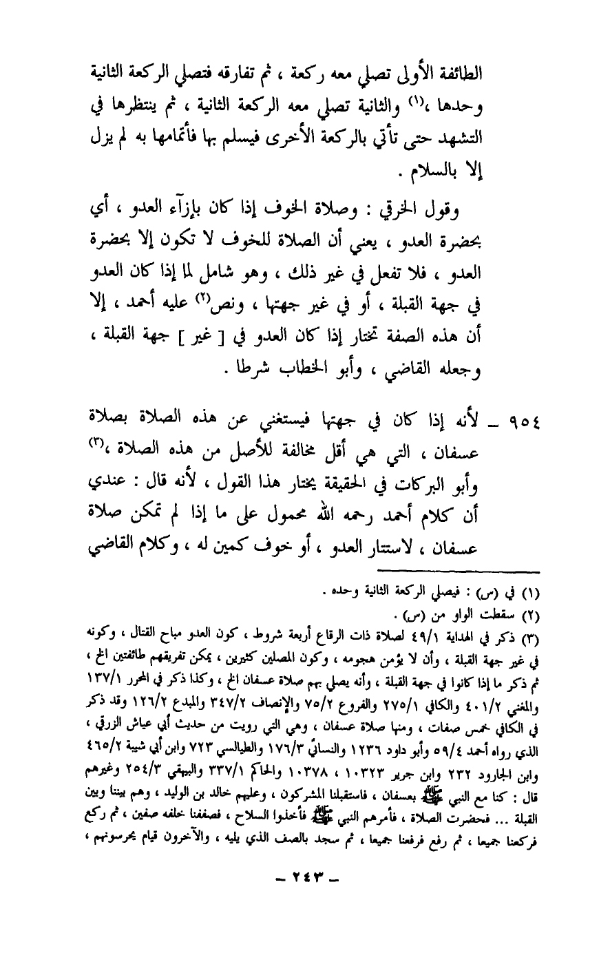 954 - لأنه إذا كان في جهتها فيستغني عن هذه الصلاة بصلاة عسفان، التي هي أقل مخالفة للأصل من هذه الصلاة، وأبو البركات في الحقيقة يختار هذا القول، لأنه قال: عندي أن كلام أحمد - رَحِمَهُ اللَّهُ - محمول على ما إذا لم تمكن صلاة عسفان، لاستتار العدو، أو خوف كمين له، وكلام القاضي