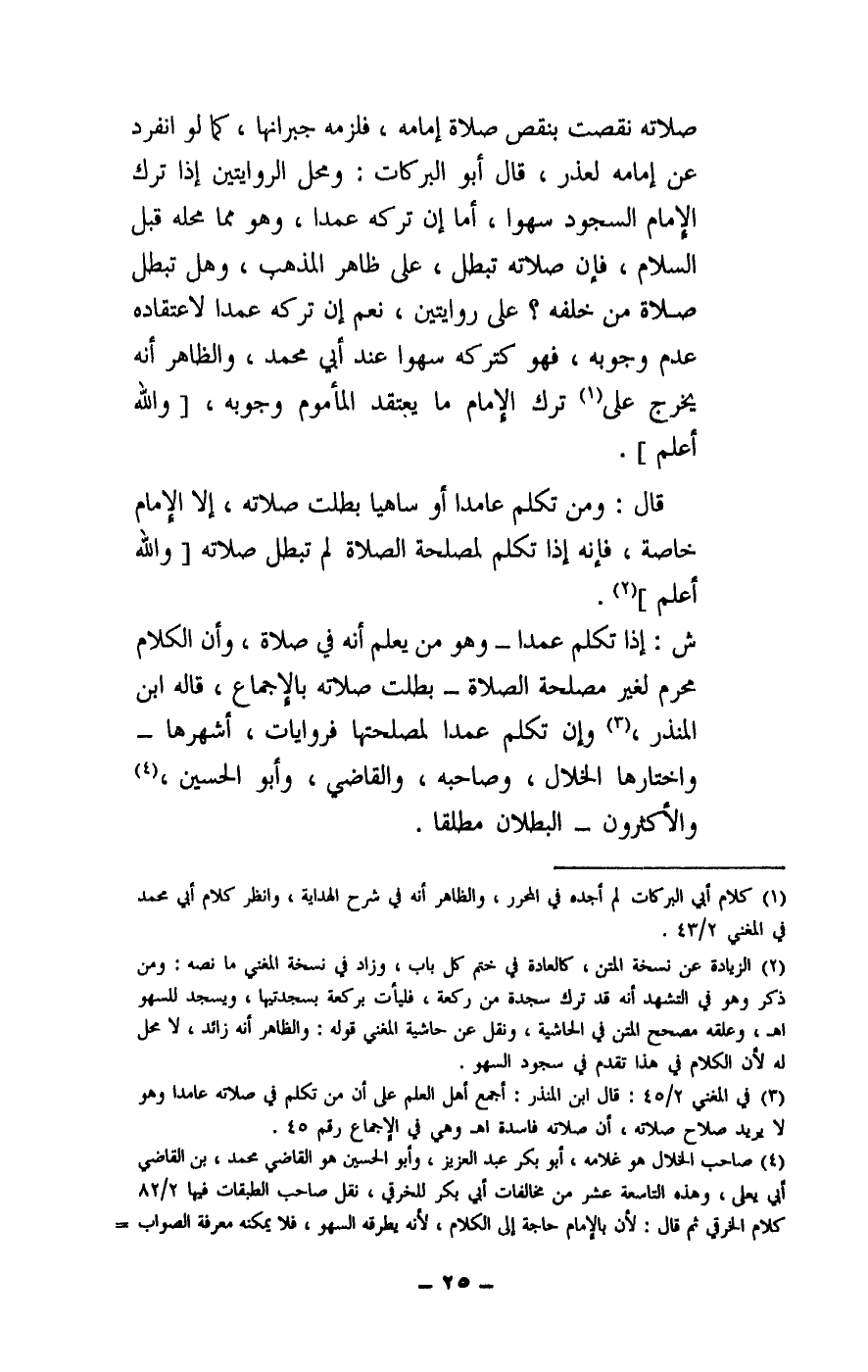 ش: إذا تكلم عمدا - وهو من يعلم أنه في صلاة، وأن الكلام محرم لغير مصلحة الصلاة - بطلت صلاته بالإجماع، قاله ابن المنذر، وإن تكلم عمدا لمصلحتها فروايات، أشهرها - واختارها الخلال، وصاحبه، والقاضي، وأبو الحسين، والأكثرون - البطلان مطلقا.