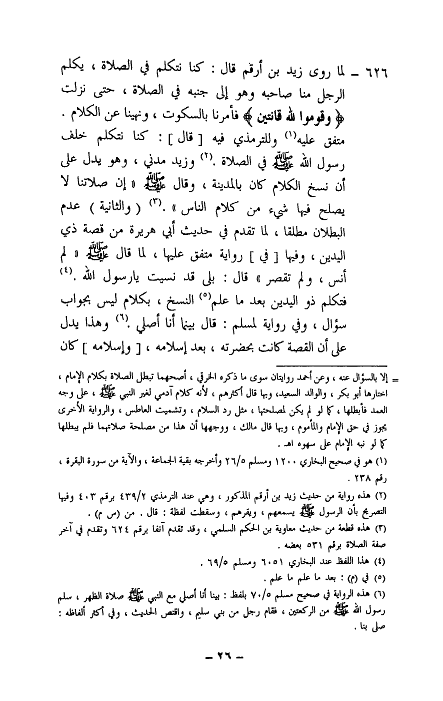 626 - لما روى زيد بن أرقم، قال: «كنا نتكلم في الصلاة، يكلم الرجل منا صاحبه وهو إلى جنبه في الصلاة، حتى نزلت: {وَقُومُوا لِلَّهِ قَانِتِينَ} [البقرة: 238] فأمرنا بالسكوت، ونهينا عن الكلام.» متفق عليه، وللترمذي فيه [قال] : «كنا نتكلم خلف رسول الله - صَلَّى اللَّهُ عَلَيْهِ وَسَلَّمَ - في الصلاة» . وزيد مدني، وهو يدل على أن نسخ الكلام كان بالمدينة، وقال - صَلَّى اللَّهُ عَلَيْهِ وَسَلَّمَ -: «إن صلاتنا لا يصلح فيها شيء من كلام الناس» . (والثانية) : عدم البطلان مطلقا، لما تقدم في حديث أبي هريرة من قصة ذي اليدين، وفيها [في] رواية متفق عليها، لما قال - صَلَّى اللَّهُ عَلَيْهِ وَسَلَّمَ -: «لم أنس، ولم تقصر» قال: بلى قد نسيت يا رسول الله. فتكلم ذو اليدين بعد ما علم النسخ، بكلام ليس بجواب سؤال، وفي رواية لمسلم، قال: بينما أنا أصلي. وهذا يدل على أن القصة كانت بحضرته، بعد إسلامه، [وإسلامه] كان