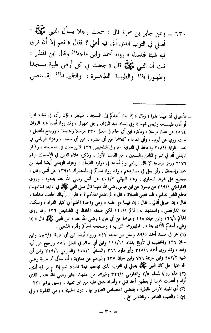630 - وعن جابر بن سمرة قال: «سمعت رجلا يسأل النبي - صَلَّى اللَّهُ عَلَيْهِ وَسَلَّمَ -: أصلي في الثوب الذي آتي فيه أهلي؟ فقال: «نعم، إلا أن ترى فيه شيئا فتغسله» رواه أحمد، وابن ماجه. وقال ابن المنذر: «ثبت أن النبي - صَلَّى اللَّهُ عَلَيْهِ وَسَلَّمَ - قال: «جعلت لي كل أرض طيبة مسجدا وطهورا» والطيبة الطاهرة، والتقييد يقتضي
