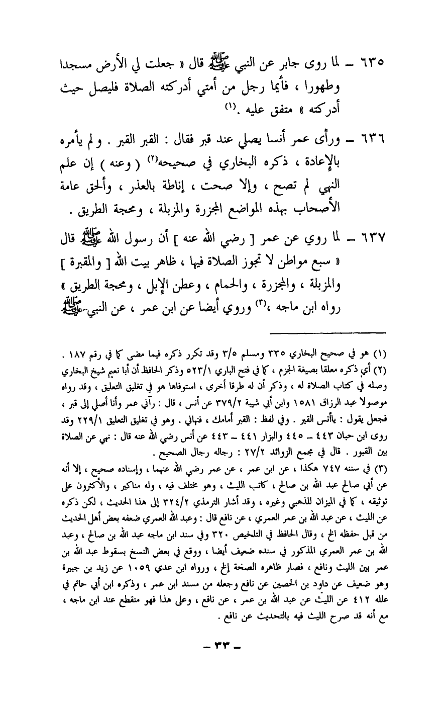 637 - لما روي عن عمر [- رَضِيَ اللَّهُ عَنْهُ -] أن رسول الله - صَلَّى اللَّهُ عَلَيْهِ وَسَلَّمَ - قال: «سبع مواطن لا تجوز الصلاة فيها: ظاهر بيت الله، [والمقبرة] ، والمزبلة، والمجزرة، والحمام، وعطن الإبل، ومحجة الطريق» رواه ابن ماجه، وروي أيضا عن ابن عمر، عن النبي - صَلَّى اللَّهُ عَلَيْهِ وَسَلَّمَ -