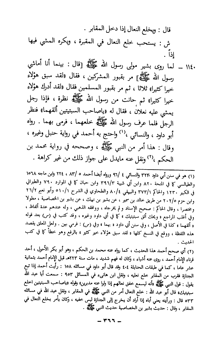 1140 - لما «روى بشير مولى رسول الله - صَلَّى اللَّهُ عَلَيْهِ وَسَلَّمَ -[قال: (بينما أنا أماشي رسول الله - صَلَّى اللَّهُ عَلَيْهِ وَسَلَّمَ -] مر بقبور المشركين، فقال: «لقد سبق هؤلاء خيرا كثيرا» ثلاثا، ثم مر بقبور المسلمين فقال: «لقد أدرك هؤلاء خيرا كثيرا» ثم حانت من رسول الله - صَلَّى اللَّهُ عَلَيْهِ وَسَلَّمَ - نظرة، فإذا رجل يمشي عليه نعلان، فقال له: «يا صاحب السبتيتين ألقهما» فنظر الرجل فلما عرف رسول الله - صَلَّى اللَّهُ عَلَيْهِ وَسَلَّمَ - خلعهما، فرمى بهما) » . رواه أبو داود، والنسائي، واحتج به أحمد في رواية حنبل وغيره، وقال: هذا أمر من النبي - صَلَّى اللَّهُ عَلَيْهِ وَسَلَّمَ - وصححه في رواية محمد بن الحكم، ونقل عنه ما يدل على جواز ذلك من غير كراهة.