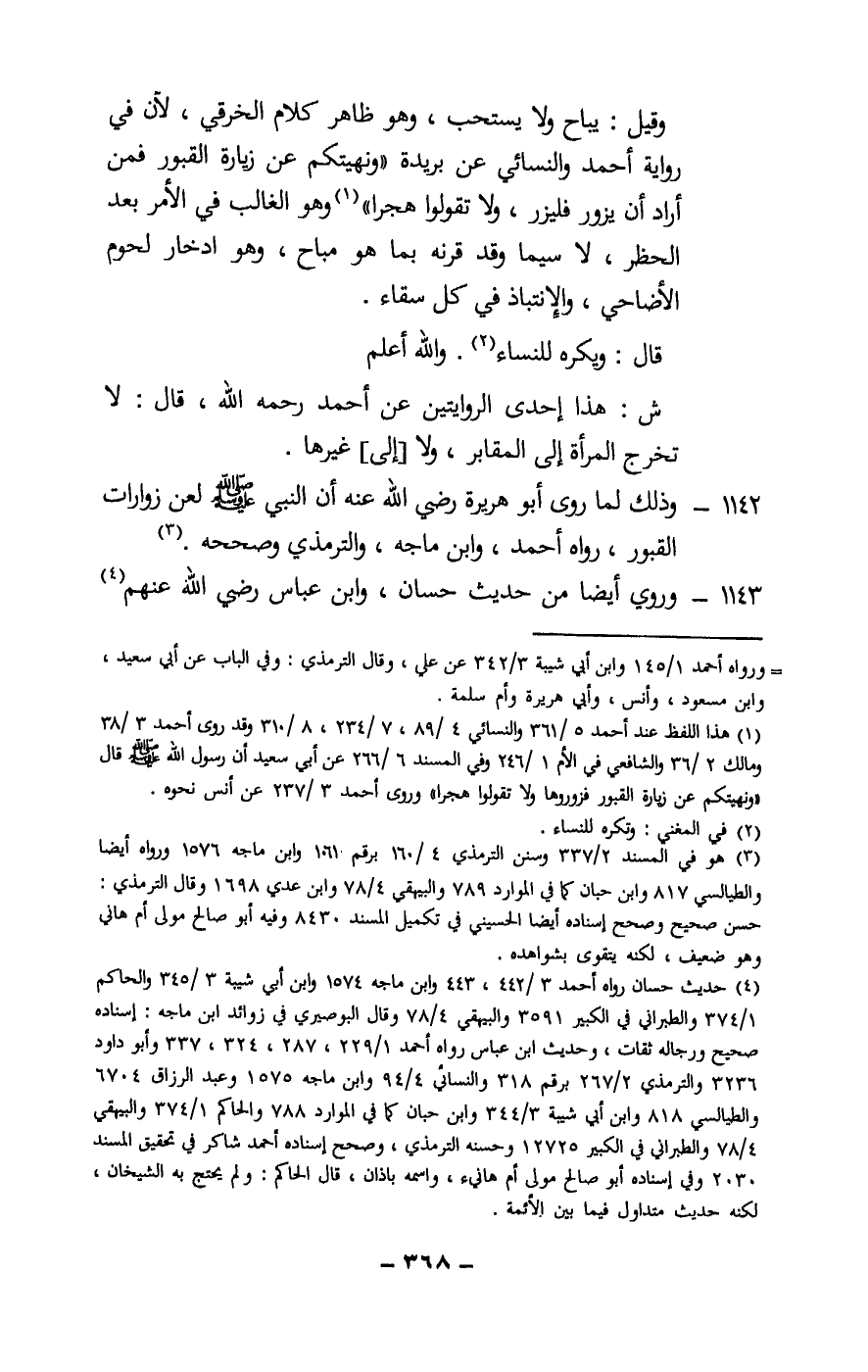 1142 - وذلك لما روى أبو هريرة - رَضِيَ اللَّهُ عَنْهُ - «أن النبي - صَلَّى اللَّهُ عَلَيْهِ وَسَلَّمَ - لعن زوارات القبور» رواه أحمد، وابن ماجه، والترمذي وصححه.