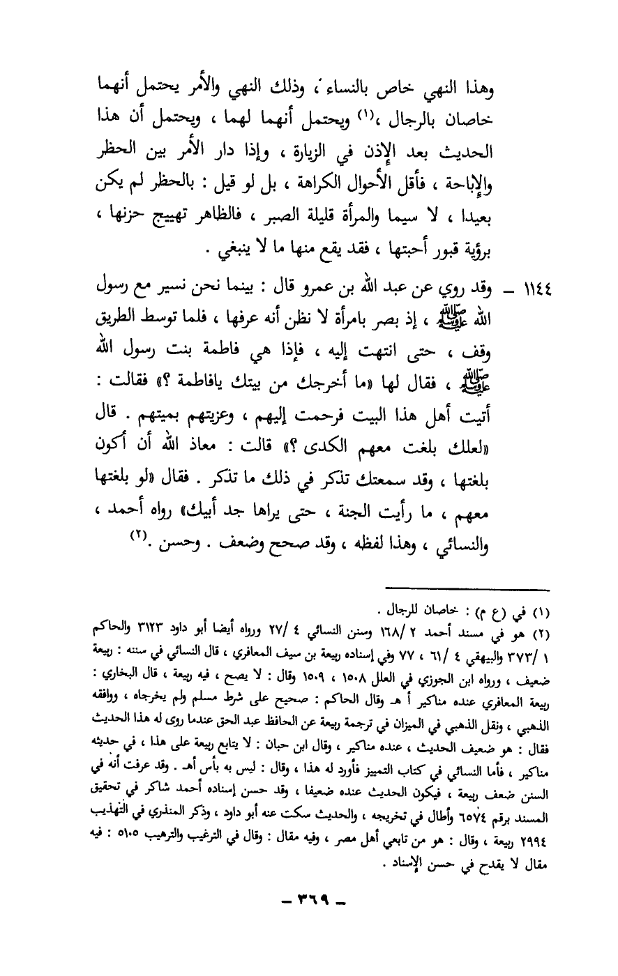 1144 - وقد روي عن عبد الله بن عمرو قال: «بينما نحن نسير مع رسول الله - صَلَّى اللَّهُ عَلَيْهِ وَسَلَّمَ - إذ بصر بامرأة لا نظن أنه عرفها، فلما توسط الطريق وقف، حتى انتهت إليه، فإذا هي فاطمة بنت رسول الله - صَلَّى اللَّهُ عَلَيْهِ وَسَلَّمَ - فقال لها: «ما أخرجك من بيتك يا فاطمة؟» فقالت: أتيت أهل هذا البيت فرحمت إليهم، وعزيتهم بميتهم. قال: «لعلك بلغت معهم الكدى؟» قالت: معاذ الله أن أكون بلغتها، وقد سمعتك تذكر في ذلك ما تذكر. فقال: «لو بلغتها معهم، ما رأيت الجنة، حتى يراها جد أبيك» رواه أحمد، والنسائي، وهذا لفظه، وقد صحح وضعف. وحسن.