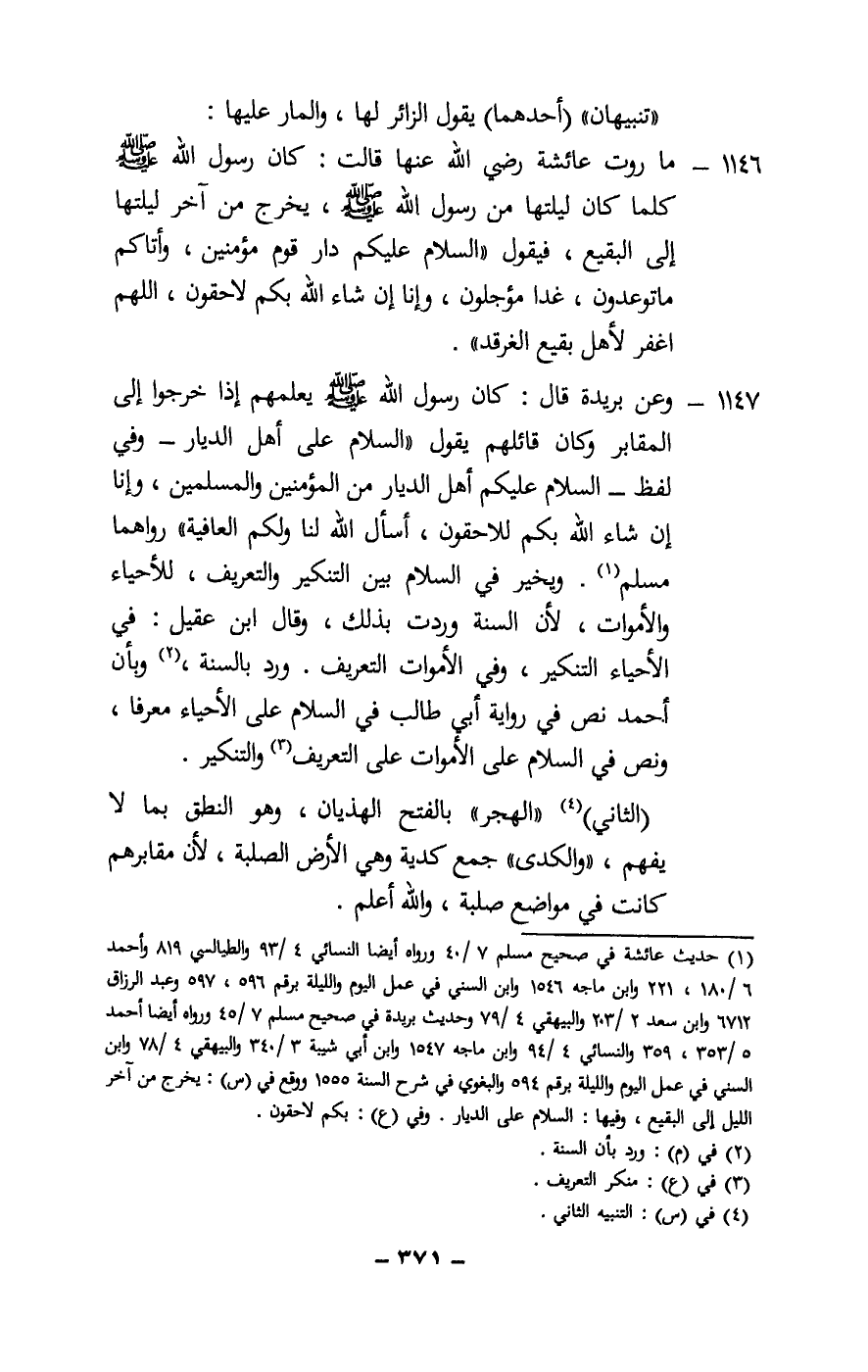 1147 - وعن بريدة قال: «كان رسول الله - صَلَّى اللَّهُ عَلَيْهِ وَسَلَّمَ - يعلمهم إذا خرجوا إلى المقابر وكان قائلهم يقول: «السلام على أهل الديار - وفي لفظ - السلام عليكم أهل الديار من المؤمنين والمسلمين، وإنا إن شاء الله بكم للاحقون، أسأل الله لنا ولكم العافية» رواهما مسلم. ويخير في السلام بين التنكير والتعريف، للأحياء والأموات؛ لأن السنة وردت بذلك، وقال ابن عقيل: في الأحياء التنكير، وفي الأموات التعريف. ورد بالسنة، وبأن أحمد نص في رواية أبي طالب في السلام على الأحياء معرفا، ونص في السلام على الأموات على التعريف والتنكير.