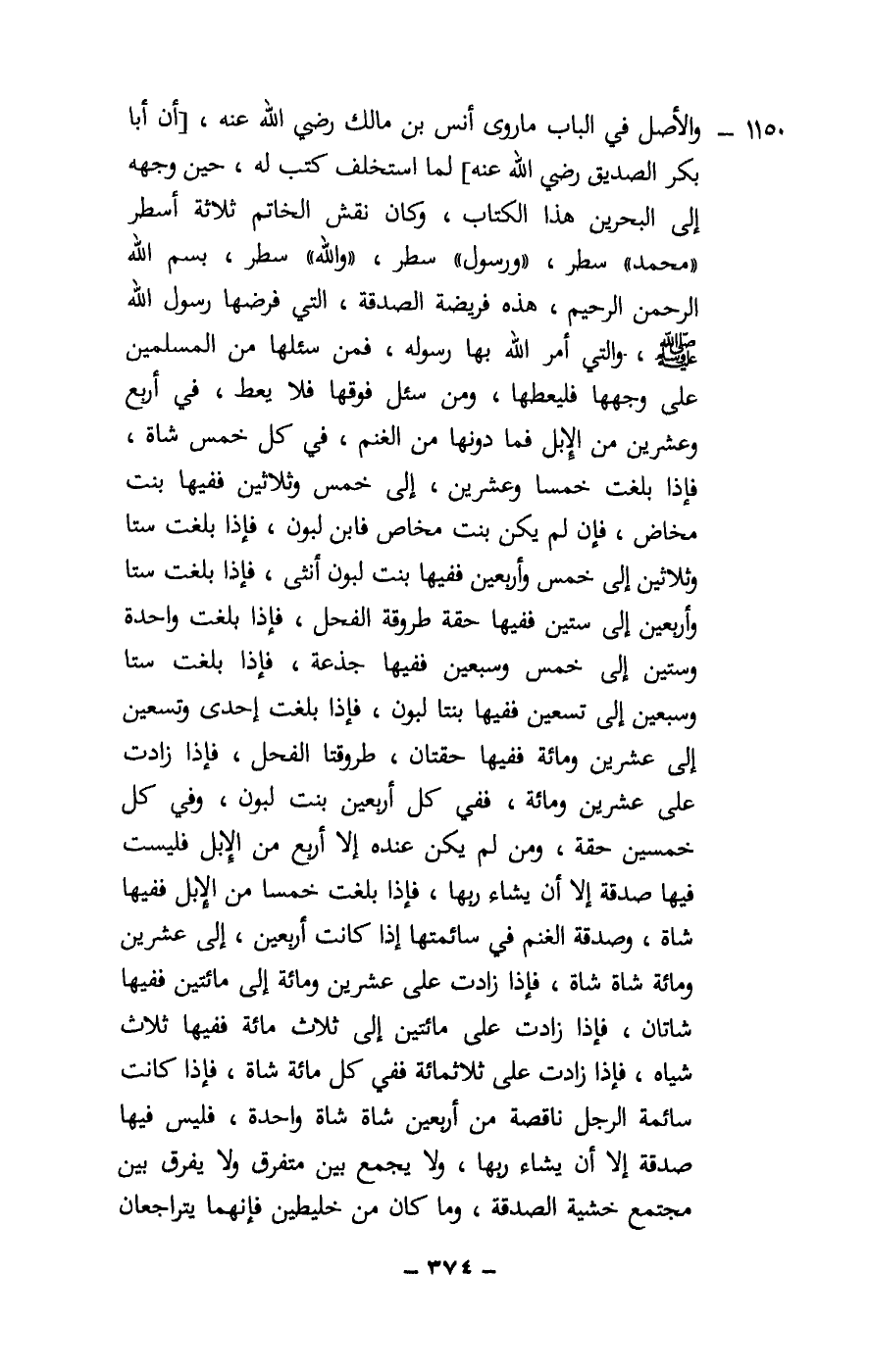 1150 - والأصل في الباب ما «روى أنس بن مالك - رَضِيَ اللَّهُ عَنْهُ -، [أن أبا بكر الصديق - رَضِيَ اللَّهُ عَنْهُ -] لما استخلف كتب له، حين وجهه إلى البحرين هذا الكتاب، وكان نقش الخاتم ثلاثة أسطر «محمد» سطر، «ورسول» سطر، «والله» سطر، بِسْمِ اللَّهِ الرَّحْمَنِ الرَّحِيمِ، هذه فريضة الصدقة، التي فرضها رسول الله - صَلَّى اللَّهُ عَلَيْهِ وَسَلَّمَ - والتي أمر الله بها رسوله، فمن سئلها من المسلمين على وجهها فليعطها، ومن سئل فوقها فلا يعط، في أربع وعشرين من الإبل فما دونها من الغنم، في كل خمس شاة، فإذا بلغت خمسا وعشرين، إلى خمس وثلاثين ففيها بنت مخاض، فإن لم يكن بنت مخاض فابن لبون، فإذا بلغت ستا وثلاثين إلى خمس وأربعين ففيها بنت لبون أنثى، فإذا بلغت ستا وأربعين إلى ستين ففيها حقة طروقة الفحل، فإذا بلغت واحدة وستين إلى خمس وسبعين ففيها جذعة، فإذا بلغت ستا وسبعين إلى تسعين ففيها بنتا لبون، فإذا بلغت إحدى وتسعين إلى عشرين ومائة ففيها حقتان، طروقتا الفحل، فإذا زادت على عشرين ومائة، ففي كل أربعين بنت لبون، وفي كل خمسين حقة، ومن لم يكن عنده إلا أربع من الإبل فليست فيها صدقة إلا أن يشاء ربها، فإذا بلغت خمسا من الإبل ففيها شاة، وصدقة الغنم في سائمتها إذا كانت أربعين، إلى عشرين ومائة شاة شاة، فإذا زادت على عشرين ومائة إلى مائتين ففيها شاتان، فإذا زادت على مائتين إلى ثلاث مائة ففيها ثلاث شياه، فإذا زادت على ثلاثمائة ففي كل مائة شاة، فإذا كانت سائمة الرجل ناقصة من أربعين شاة شاة واحدة، فليس فيها صدقة إلا أن يشاء ربها، ولا يجمع بين متفرق ولا يفرق بين مجتمع خشية الصدقة، وما كان من خليطين فإنهما يتراجعان