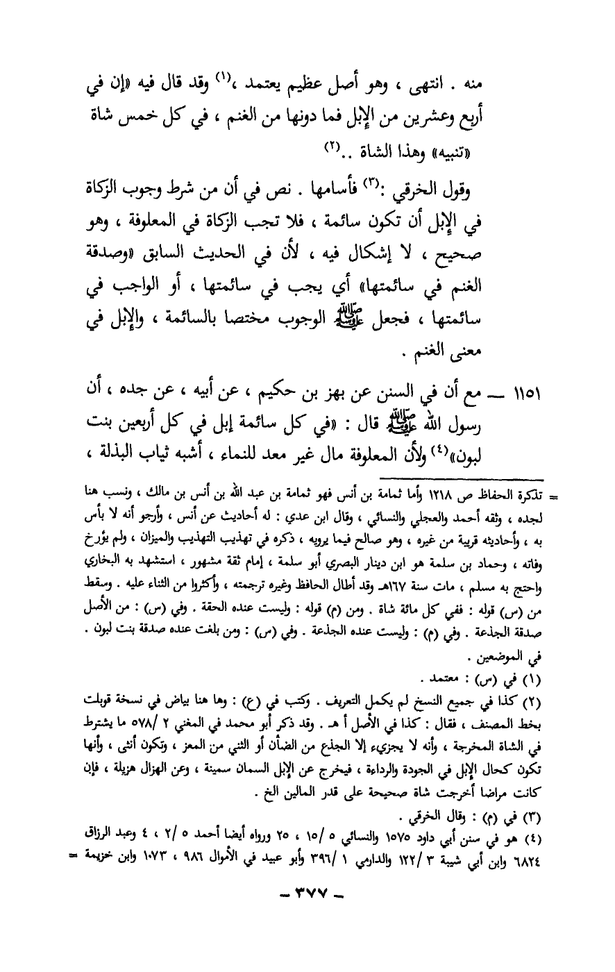 1151 - مع أن في السنن عن بهز بن حكيم، عن أبيه، عن جده، أن رسول الله - صَلَّى اللَّهُ عَلَيْهِ وَسَلَّمَ - قال: «في كل سائمة إبل في كل أربعين بنت لبون» ولأن المعلوفة مال غير معد للنماء، أشبه ثياب البذلة،