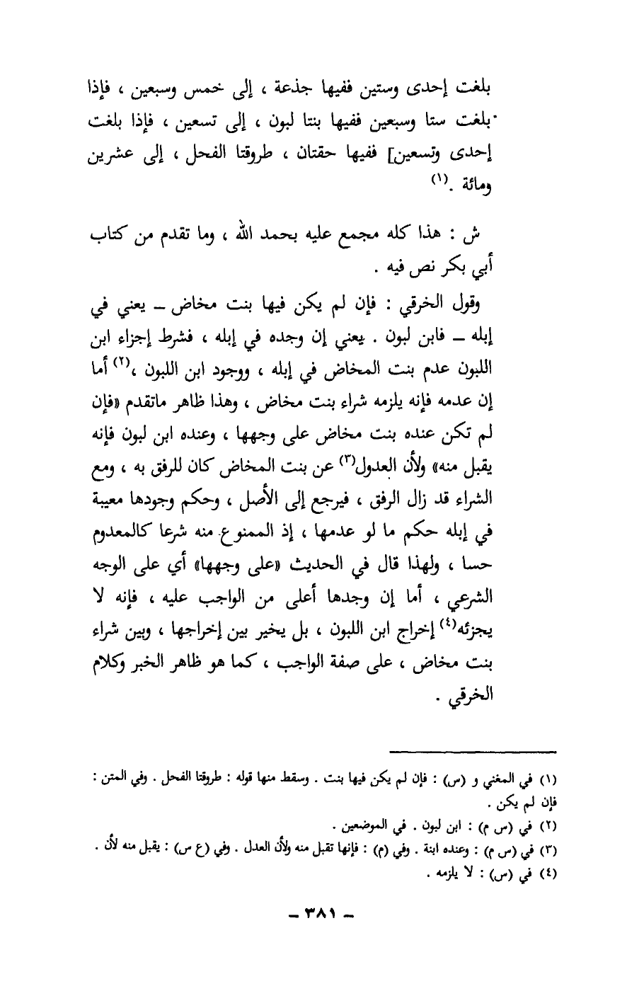 وقول الخرقي: فإن لم يكن فيها بنت مخاض - يعني في إبله - فابن لبون. يعني إن وجده في إبله، فشرط إجزاء ابن اللبون عدم بنت المخاض في إبله، ووجود ابن اللبون، أما إن عدمه فإنه يلزمه شراء بنت مخاض، وهذا ظاهر ما تقدم «فإن لم تكن عنده بنت مخاض على وجهها، وعنده ابن لبون فإنه يقبل منه» ولأن العدول عن بنت المخاض كان للرفق به، ومع الشراء قد زال الرفق، فيرجع إلى الأصل، وحكم وجودها معيبة في إبله حكم ما لو عدمها، إذ الممنوع منه شرعا كالمعدوم حسا، ولهذا قال في الحديث «على وجهها» أي على الوجه الشرعي، أما إن وجدها أعلى من الواجب عليه، فإنه لا يجزئه إخراج ابن اللبون، بل يخير بين إخراجها، وبين شراء بنت مخاض، على صفة الواجب، كما هو ظاهر الخبر وكلام الخرقي.