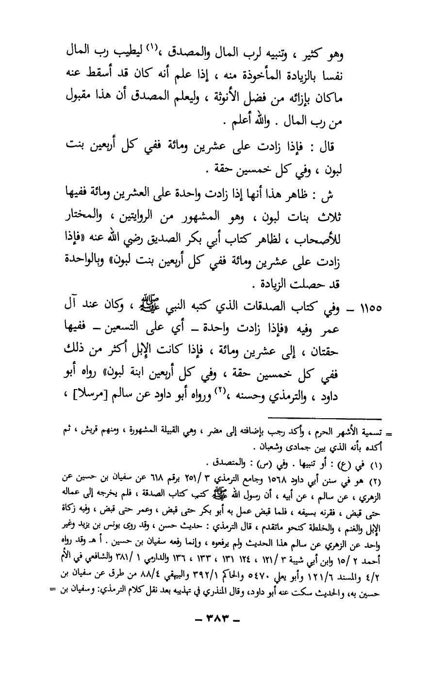 1155 - وفي كتاب الصدقات الذي كتبه النبي - صَلَّى اللَّهُ عَلَيْهِ وَسَلَّمَ - وكان عند آل عمر وفيه «فإذا زادت واحدة - أي على التسعين - ففيها حقتان، إلى عشرين ومائة، فإذا كانت الإبل أكثر من ذلك ففي كل خمسين حقة، وفي كل أربعين ابنة لبون» رواه أبو داود، والترمذي وحسنه، ورواه أبو داود عن سالم [مرسلا] ،
