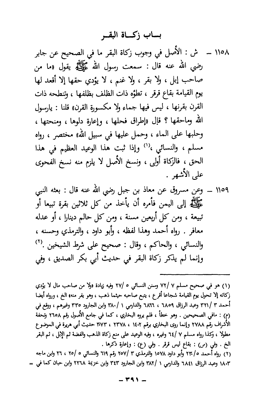 1158 - ش: الأصل في وجوب زكاة البقر ما في الصحيح عن جابر - رَضِيَ اللَّهُ عَنْهُ - قال: «سمعت رسول الله - صَلَّى اللَّهُ عَلَيْهِ وَسَلَّمَ - يقول: «ما من صاحب إبل، ولا بقر، ولا غنم، لا يؤدي حقها إلا أقعد لها يوم القيامة بقاع قرقر، تطؤه ذات الظلف بظلفها، وتنطحه ذات القرن بقرنها، ليس فيها جماء ولا مكسورة القرن» قلنا: يا رسول الله وما حقها؟ قال: «إطراق فحلها، وإعارة دلوها، ومنحتها، وحلبها على الماء، وحمل عليها في سبيل الله» مختصر، رواه مسلم، والنسائي، وإذا ثبت هذا الوعيد العظيم في هذا الحق، فالزكاة أولى، ونسخ الأصل لا يلزم منه نسخ الفحوى على الأشهر.