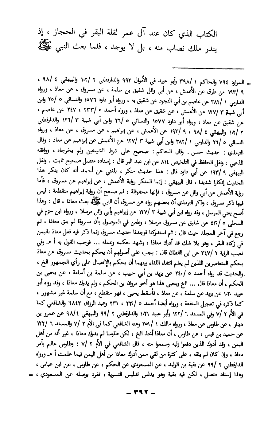 الكتاب الذي كان عند آل عمر لقلة البقر في الحجاز، إذ يندر ملك نصاب منه، بل لا يوجد، فلما بعث النبي - صَلَّى اللَّهُ عَلَيْهِ وَسَلَّمَ - –