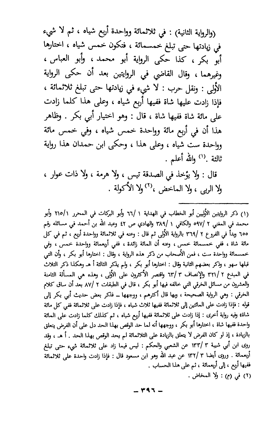(والرواية الثانية) : في ثلاثمائة وواحدة أربع شياه، ثم لا شيء في زيادتها حتى تبلغ خمسمائة، فتكون خمس شياه، اختارها أبو بكر، كذا حكى الرواية أبو محمد، وأبو العباس، وغيرهما، وقال القاضي في الروايتين بعد أن حكى الرواية الأولى: ونقل حرب: لا شيء في زيادتها حتى تبلغ ثلاثمائة، فإذا زادت عليها شاة ففيها أربع شياه، وعلى هذا كلما زادت على مائة شاة ففيها شاة، قال: وهو اختيار أبي بكر. وظاهر هذا أن في أربع مائة وواحدة خمس شياه، وفي خمس مائة وواحدة ست شياه، وعلى هذا، وحكى ابن حمدان هذا رواية ثالثة. والله أعلم.