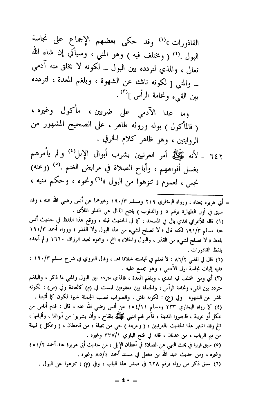 642 - لأنه أمر العرنيين بشرب أبوال الإبل ولم يأمرهم بغسل أفواههم، وأباح الصلاة في مرابض الغنم. (وعنه) نجس، لعموم «تنزهوا من البول» ونحوه، وحكم منيه،