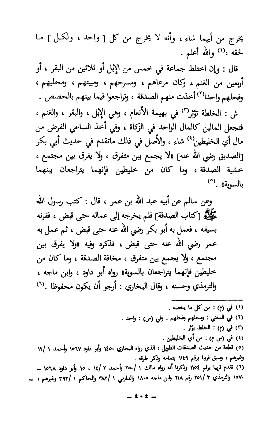 وعن سالم عن أبيه عبد الله بن عمر، قال: كتب رسول الله - صَلَّى اللَّهُ عَلَيْهِ وَسَلَّمَ -: [كتاب الصدقة] فلم يخرجه إلى عماله حتى قبض، فقرنه بسيفه، فعمل به أبو بكر - رَضِيَ اللَّهُ عَنْهُ - حتى قبض، ثم عمل به عمر - رَضِيَ اللَّهُ عَنْهُ - حتى قبض، فذكره وفيه «ولا يفرق بين مجتمع، ولا يجمع ين متفرق، مخافة الصدقة، وما كان من خليطين فإنهما يتراجعان بالسوية» رواه أبو داود وابن ماجه، والترمذي وحسنه، وقال البخاري: أرجو أن يكون محفوظا.