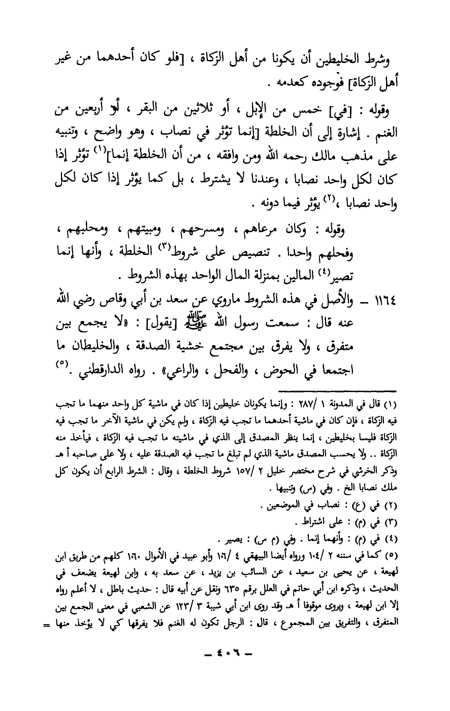 1164 - والأصل في هذه الشروط ما روي عن سعد بن أبي وقاص - رَضِيَ اللَّهُ عَنْهُ - قال: سمعت رسول الله - صَلَّى اللَّهُ عَلَيْهِ وَسَلَّمَ -[يقول] : «لا يجمع بين متفرق، ولا يفرق بين مجتمع خشية الصدقة، والخليطان ما اجتمعا في الحوض، والفحل، والراعي» . رواه الدراقطني.