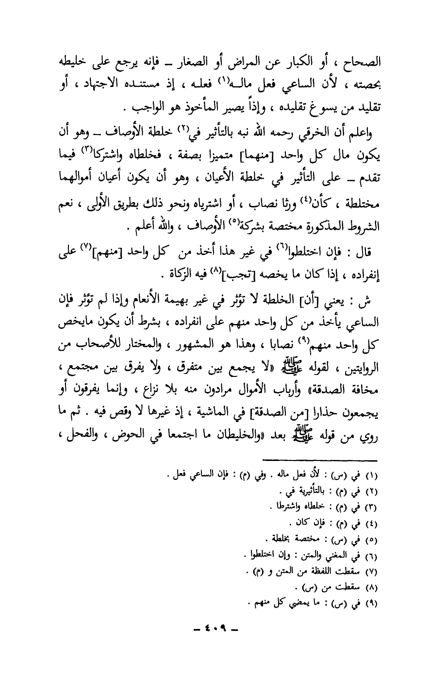 واعلم أن الخرقي - رَحِمَهُ اللَّهُ - نبه بالتأثير في خلطة الأوصاف - وهو أن يكون مال كل واحد [منهما] متميزا بصفة، فخلطاه واشتركا فيما تقدم - على التأثير في خلطة الأعيان، وهو أن يكون أعيان أموالهما مختلطة، كأن ورثا نصاب، أو اشترياه ونحو ذلك بطريق الأولى، نعم الشروط المذكورة مختصة بشركة الأوصاف، والله أعلم.